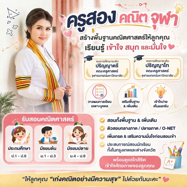 - สอนวิชาคณิตศาสตร์พื้นฐานและเพิ่มเติม นักเรียนระดับมัธยมศึกษาตอนต้น ม.1-3 ระดับมัธยมศึกษาตอนปลาย ม.4-6