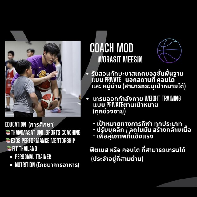 รับสอนกีฬาบาสเกตบอลตั้งแต่อายุ 7 ปีขึ้นไป สอนทั้งเดี่ยวและกลุ่ม