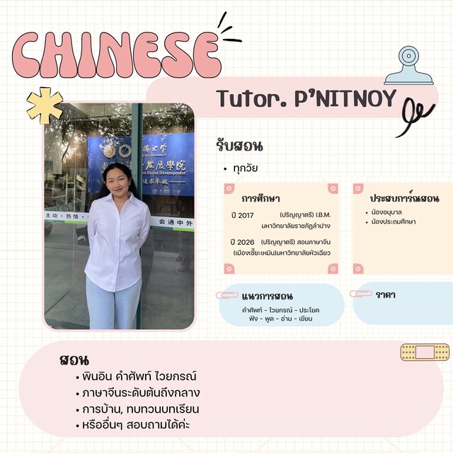 ปัจจุบันรับสอนภาษาจีนกลาง , มีประสบการณ์สอนตั้งแต่เด็กเล็ก-ผู้ใหญ่ ,ชาวต่างชาติ(ญี่ปุ่น)
