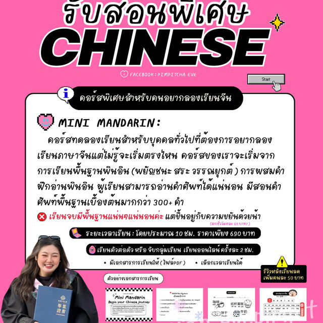 • รับสอนพิเศษภาษาจีน ในระดับพื้นฐานขึ้นไป *ตั้งแต่พินอิน (ตัวอักษร สระ เสียงววรณยุกต์) การสะกดคำ ฝึกอ่าน ฝึกฟัง การเรียนหลักไวยากรณ์ เน้นอ่านพินอินออก พูดได้ ฝึกให้นักเรียนมีความกล้าแสดงออกในการเรียนรู้เพราะอยากให้เด็ก…