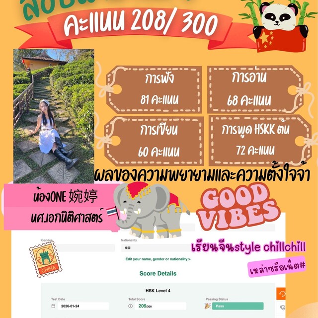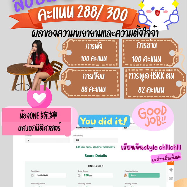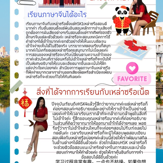 ภาษาจีนไม่ได้ยาก แต่ก็ไม่ได้ง่าย ดังนั้นทุกคนสามารถเรียนรู้และพัฒนาตัวเองให้เก่งขึ้นตามต้องการได้ เพียงแค่มีแพชชั่น มีเป้าหมายที่ชัดเจน ไม่ว่าเป้าหมายนั้นจะสูงแค่ไหนก็ขอให้ตั้งใจทำให้เต็มที่ที่สุด ผลออกมาเป็นยังไงเราก็จะพอใจและไม่เสียใจที่ได้ทำ แต่หากไม่ลงมือทำก็จะเสียดายเหมือนที่พี่เองก็อยากเป็นติว…