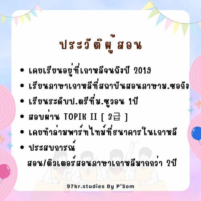 จากผู้สอนมีประสบการณ์แลกเปลี่ยนที่ประเทศเกาหลี 6 เดือน ในกิจกรรม Edupac Camp ตอนเรียนมหาวิทยาลัยปี 2 และหลังจากเรียนจบ ก็ใช้ชีวิตอยู่ที่เกาหลีจนถึงช่วงก่อนโควิด-19 ระบาด ตอนนี้กลับมาอยู่ไทยค่ะ ผู้สอนผ่านการสอบวัดระดับเกาหลี Topik II ระดับ 4 ( 4급 ) แล้วค่ะ