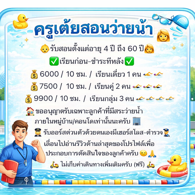 ✅ รับสอนเฉพาะลูกค้าที่มีสระว่ายน้ำในหมู่บ้าน/คอนโดหรือสปอร์ตคลับ เท่านั้นนะครับ