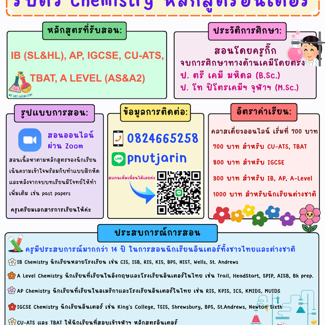 รับสอนพิเศษเคมีหลักสูตรอินเตอร์,TBAT (Chemistry part), IB Chemistry ( SL, HL), AP Chemistry, IGCSE, CU-ATS Chemistry, A Level (AS&A2) สอนเคมี EP ทั้งแบบตัวต่อตัวและเป็นกลุ่ม เน้นปูพื้นฐานและสร้างความเข้าใจพร้อมทั้งฝึกทักษะการทำโจทย์ที่หลากหลาย มีเอกสารการเรียนให้ค่ะ