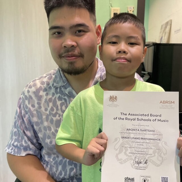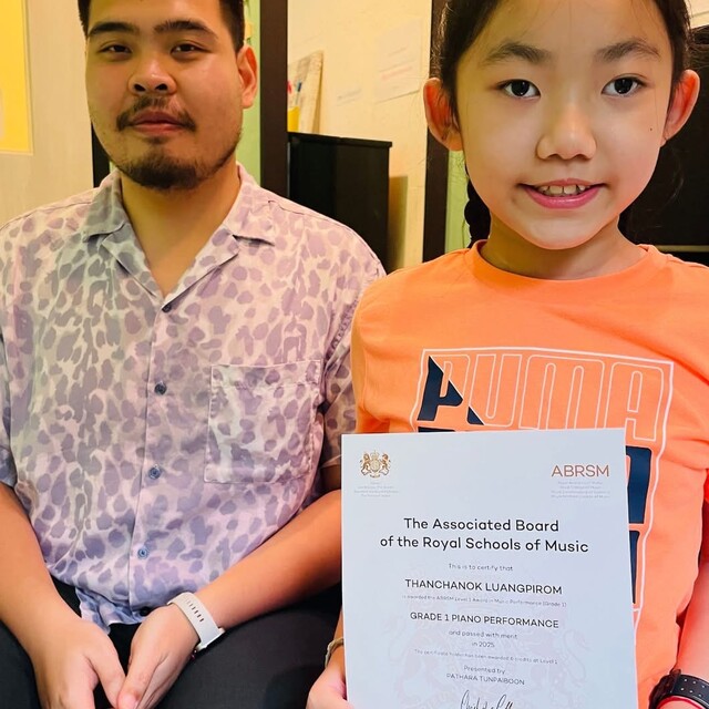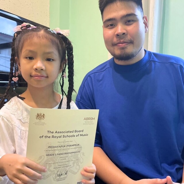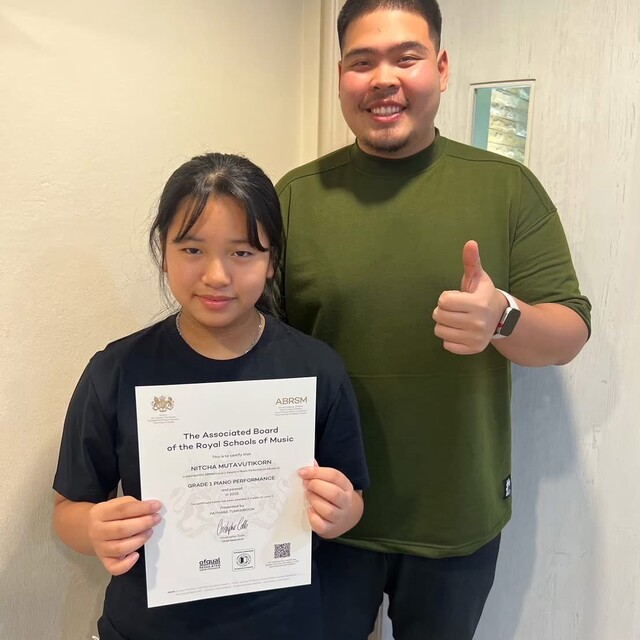 ครูผู้สอนผ่านการสอบเปียโนหลักสูตร Trinity College London Grade 8 ด้วยคะแนนเกียรตินิยมอันดับ 1