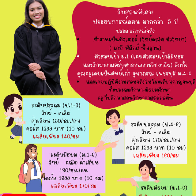 - ประสบการณ์สอนพิเศษมากกว่า 5 ปี คณิต -วิทย์