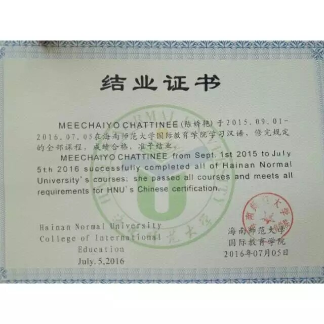 • ผ่านการศึกษาภาษาจีนที่มณฑลไห่หนาน มหาวิทยาลัย海南师范大学 1 ปี