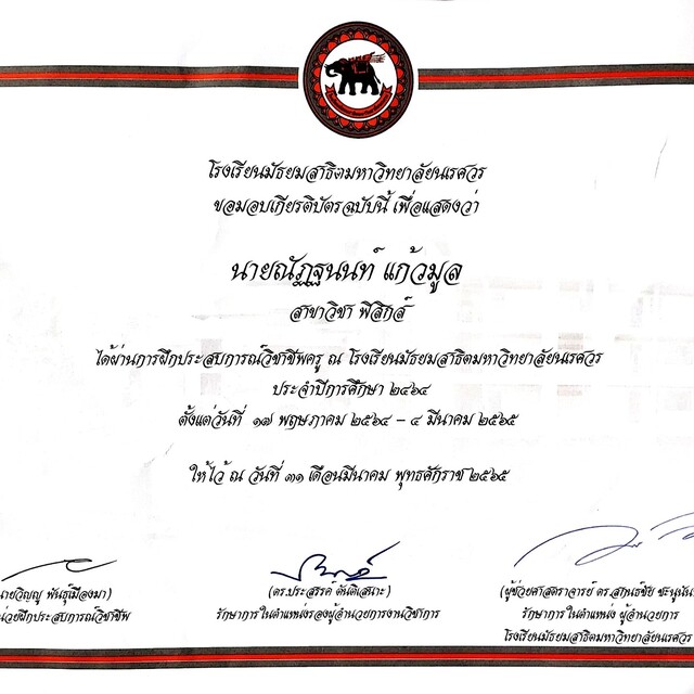 - ฝึกประสบการณ์วิชาชีพครูโรงเรียนมัธยมสาธิตมหาวิทยาลัยนเรศวร รายวิชาฟิสิกส์ 1,2 ทั้งห้องธรรมดาและโครงการ วมว.