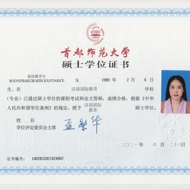 1.จบปริญญาโทด้านการสอนภาษาจีน จากมหาวิทยาลัย首都师范大学 (Normal Capital University) ที่ปักกรุง ประเทศจีน