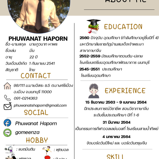 ผมชื่อนาย ภูวนาท หาพร จบจากมหาวิทยาลัยราชภัฏบ้านสมเด็จเจ้าพระยา สาขาภาษาจีน อายุ 23 ปี