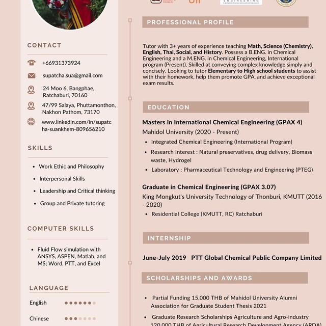 M.ENG. Chemical Engineering (GPAX 3.07), Integrated chemical Engineering (International Program), Mahidol university (2020-Present) (GPAX 4.00)