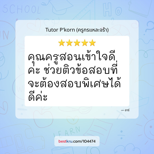 คุณครูสอนเข้าใจดีค่ะ ช่วยติวข้อสอบที่จะต้องสอบพิเศษได้ดีค่ะ