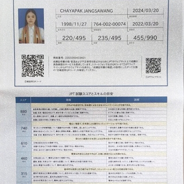 NU61 JPT 455 คะแนน เทียบเท่าN3 จบมนุษยศาสตร์ภาษาญี่ปุ่นโดยตรง ช่วยแนะนำแนวทางการศึกษาได้ เคยไปแลกเปลี่ยนระยะสั้นที่ประเทศญี่ปุ่นค่ะ
