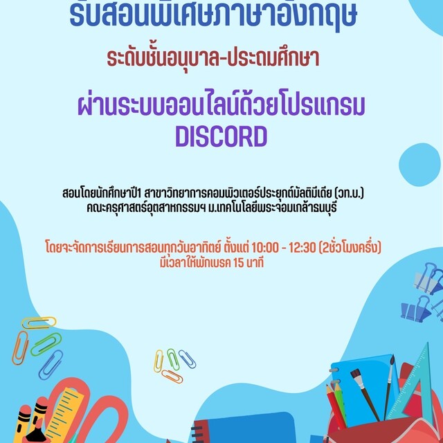 โดยผมจะทำการสอนพิเศษวิชาภาษาอังกฤษในรูปแบบออนไลน์ในช่วงวันอาทิตย์เวลา 10:00น. โดยผมจะสอนเด็กๆในข่วงวัยตั้งแต่อนุบาล-ประถมศึกษา