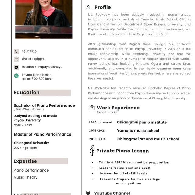 เรียนกับผู้เชี่ยวชาญด้านการแสดงเปียโน เรียนเทคนิคต่างๆสำหรับบทเพลงคลาสสิค การเรียนรู้โน้ตดนตรี การแสดงเปียโนแบบมืออาชีพ การเข้าถึงความเป็น musician ปรับพื้นฐานจังหวะ ความคิดเพื่อต่อยอดด้านดนตรีหรือการแข่งขัน