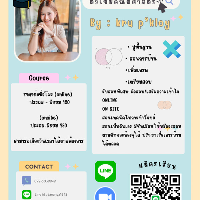 จบครูคณิตศาสตร์โดยตรง มีประสบการณ์การสอน คุณครูใจดี มีเทคนิคการคิด และการจำ ดีๆมากฝาก