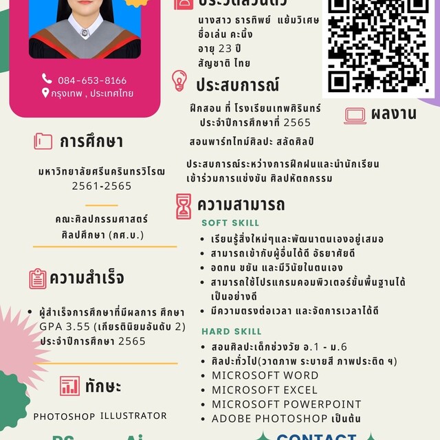 สวัสดีค่ะ ชื่อ ธารทิพย์ แย้มวิเศษ ชื่อเล่น คะนิ้ง เคยสอนนักเรียนตั้งแต่ 3 - 12 ปี เคยสอนดรออิ้งนักเรียนชั้นมัธยมศึกษาปีที่ 1 - 6 การสอนจะเริ่มจากการให้นักเรียนเข้าใจพื้นฐาน ความหมายของงานศิลปะ อาจจะมีการทำงานรีโปรดักศิลปินชื่อดัง สอบถามนักเรียนอยู่เสมอเรื่องความสนใจของนักเรียน