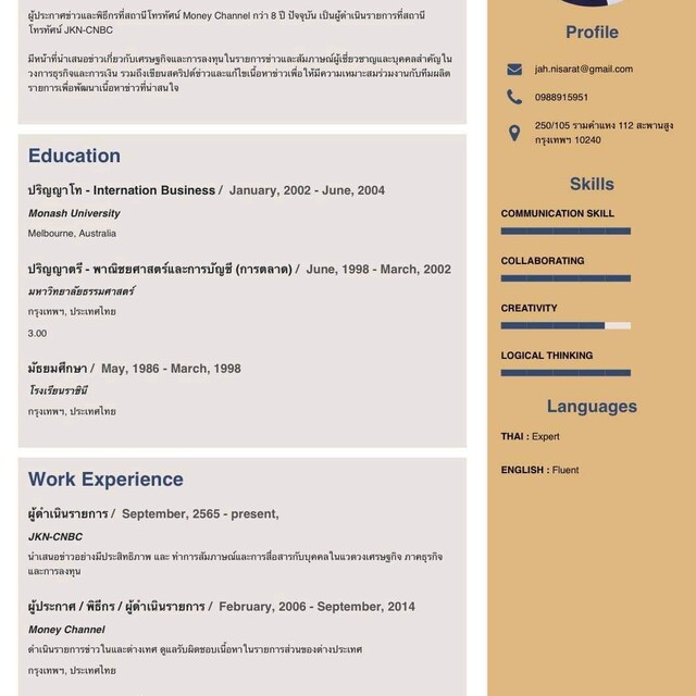 เป็นผู้ประกาศข่าวทางเศรษฐกิจ สามารถใช้ภาษาไทยไดอย่างถูกต้อง รับสอนภาษาไทยสำหรับเด็กเล็กในระดับ อนุบาล-ประถมต้น พร้อมสอนการพูดในที่สาธารณะ สามารถติดต่อได้ตลอด
