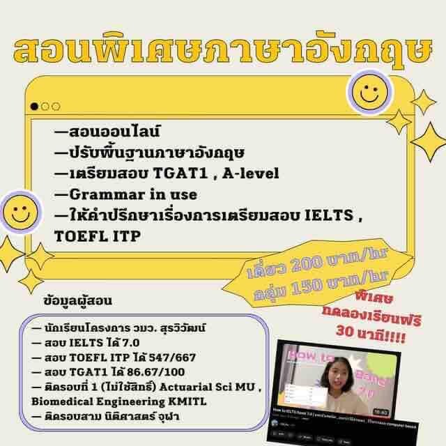 สอนพิเศษ ภาษาอังกฤษ สบายๆ เป็นกันเอง ไม่ดุ ไม่กดดัน มีโจทย์ให้ทำ เนื้อหาที่สอนมีทั้งปูพื้นฐาน เตรียมสอบ tgat , a-level , cu-tep มีประสบการณ์การสอนระดับ ม.ปลาย