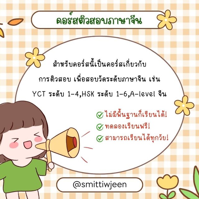 สำหรับคอร์สนี้เป็นคอร์สเกี่ยวกับการติวสอบ เพื่อเตรียมความพร้อมในการสอบวัดระดับภาษาจีน ไม่ว่าจะเป็น HSKระดับ1-5 YCT ระดับ1-4 และการสอบ A-level ภาษาจีน