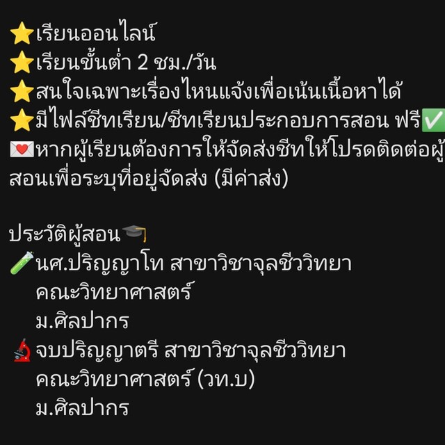 สอนคณิตศาสตร์และวิทยาศาสตร์ ชีววิทยา เคมี ฟิสิกส์ ระดับประถม-มัธยมศึกษาได้ เรียนแบบออนไลน์เน้นการปูพื้นฐานเป็นหลัก/เพิ่มเกรด/เตรียมสอบ หรือหากผู้เรียนสนใจเรื่องไหนเป็นพิเศษสามารถติดต่อแจ้งผู้สอนให้ลงรายละเอียดเจาะลึกได้ เพื่อประโยชน์ของผู้เรียน ผู้สอนขอแนะนำให้ผู้เรียนแจ้งพื้นฐานเบื้องต้นในวิชานี้ให้แก่ผู้สอนก่อนเริ่มเรียนเพื่อการเตรียมเนื้อหาที่เหมาะสมกับผู้เรียน