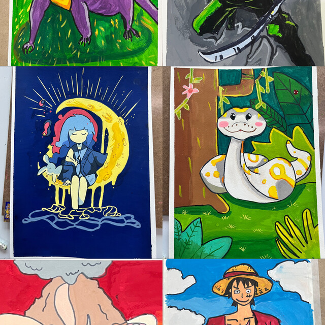 ฝึกใช้สีโปสเตอร์ การวาดเส้น นักเรียนสามารถเลือกสีที่อยากเรียนได้ เช่น สีไม้ สีโปสเตอร์ สีชอล์ค เรียนจบทุกครั้งจะได้ผลงาน1ชิ้น