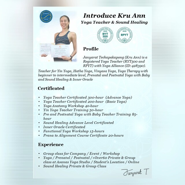 ครูแอน อาสนะโยคะ (Asanas Yoga) - ครูสอนโยคะที่ได้รับการรับรอง RYT 500 และ RPYT จาก Yoga Alliance (ID : 428390) และ ครูคลื่นเสียงบำบัด (Sound Healing)
