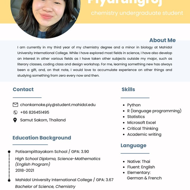 ขณะนี้เป็นนักศึกษาชั้นปีที่ 3 ภาควิชาเคมี วิทยาลัยนานาชาติ ม.มหิดล