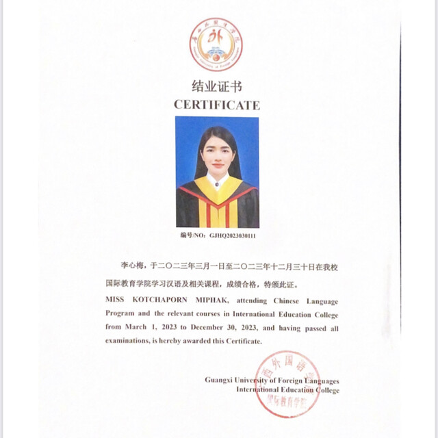 ปี2023 กันยายน-ธันวาคม ไปแลกเปลี่ยนที่มหาวิทยาลัยภาษาต่างประเทศกว่างซี ที่เมืองกว่างซี ประเทศจีน