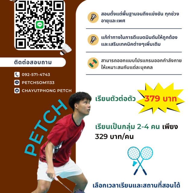 ชยุตพงศ์ เพชร สอนแบดมินตัน ตั้งแต่พื้นฐานถึงแข่งขัน เด็กผู้ใหญ่379 บาท ต่อชั่วโมง