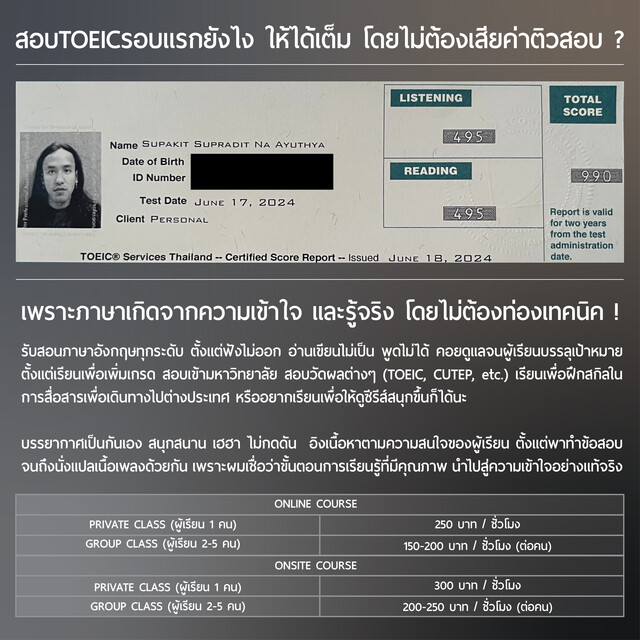 - TOEIC คะแนนเต็ม 990/990 ตั้งแต่การสอบครั้งแรก (ไม่เคยติวTOEIC) ปีพ.ศ.2567