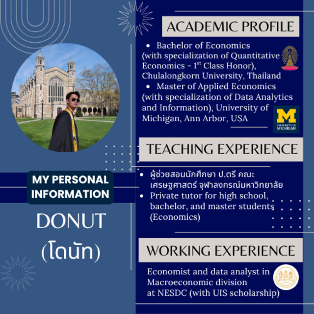 ก่อนหน้านี้ผมไม่ได้มีพื้นฐานด้าน data and econometrics แต่เทอมนี้มีวิชาเกี่ยวกับการ interpret data และผมก็ไม่ค่อยมีเวลาเรียนในม.เลยเพราะทำงานไปด้วยครับ พี่โดนัทสอนผมทั้งวิชาม้วนเดียวจบภายในหนึ่งอาทิตย์แล้วเข้าสอบเลย ทำสอบได้ดีเลยครับผม ถ้าไม่มีพี่เค้าผมน่าจะตกไปแล้วครับ