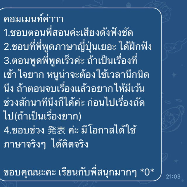 การเรียนการสอนจะเน้นการสื่อสาร และใช้งานได้จริง พร้อมปรับรูปแบบการสอน และเนื้อหาให้เข้ากับความต้องการของนักเรียนแต่ละคนด้วยค่ะ ดังนั้นนักเรียนไม่ต้องกังวล เพราะสไตล์การสอนของครูจะปรับตามเลเวลของนักเรียน เพื่อความมีประสิทธิภาพ พร้อมสอดแทรกเรื่องราวในญี่ปุ่นให้นักเรียนได้เรียนรู้ไปด้วย รับรองไม่มีเบื่อแน่นอนค่ะ🩷 มาเรียนด้วยกันเยอะๆนะคะ