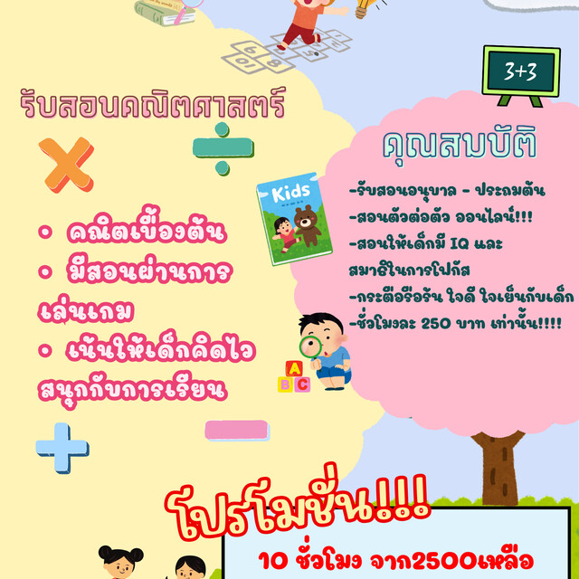 รับสอนคณิตศาสาตร์เด็กเล็ก ตั้งแต่อนุบาล-ประถมต้น เป็นการสอนแบบให้เด็กได้คิด มีเกมเข้ามาแทรกในการเรียนเพื่อนให้เด็กรู้สึกสนุกมากขึ้น สอนแบบออนไลน์ ชั่วโมงละ200 เท่านั้น!!! ถ้าเรียน 10 ชม. ลดเหลือ 1900!!! แถมฟรีให้อีก 1 ชม.