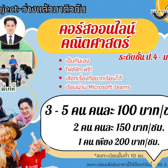 รับสอนพิเศษคณิตศาสตร์ตั้งแต่ระดับประถม ถึง มัธยม ( ตามบ้านและแบบออนไลน์ ) ราคาเริ่มต้น เพียง ชม.ละ 100 บาทต่อคน (กลุ่มย่อย 3-5 คน)