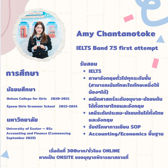 Amy ติวเตอร์เอมี่ สอนภาษาอังกฤษ คณิตศาสตร์ เคมี บัญชี เศรษฐศาสตร์