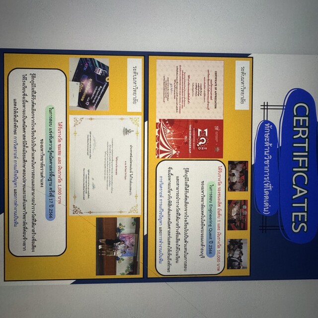 - ได้รับรางวัล distinction (Top 10%-25%ของประเทศ) ในการสอบ International chemistry quiz
