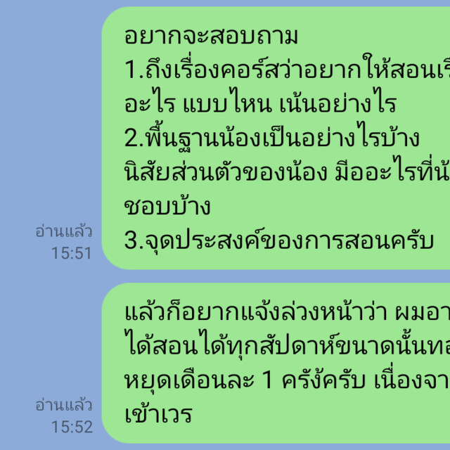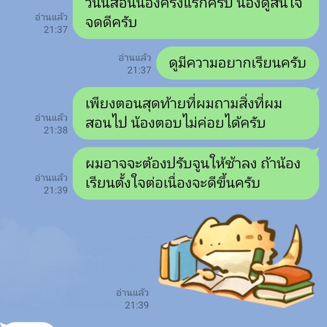 อยากให้สอนแบบสบายๆหรือดุจริงจังได้หมดตามที่ผู้ปกครองต้องการ จะมีการประเมินน้องและคุยกับผู้ปกครองทุกครั้งหลังการสอนเสร็จ