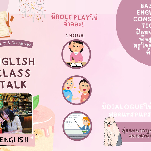 บทสนทนาเบื้องต้นพร้อมใบงานให้อ่านออกเสียงตาม และฝึกพูด สอดแทรกแกรมม่าบ้าง เช่น บทเรียน การทักทาย การสั่งอาหาร เหมาะกับผู้เริ่มต้นเรียนภาษาอังกฤษ ไม่ต้องกลัวผิด ครูใจดีมาก