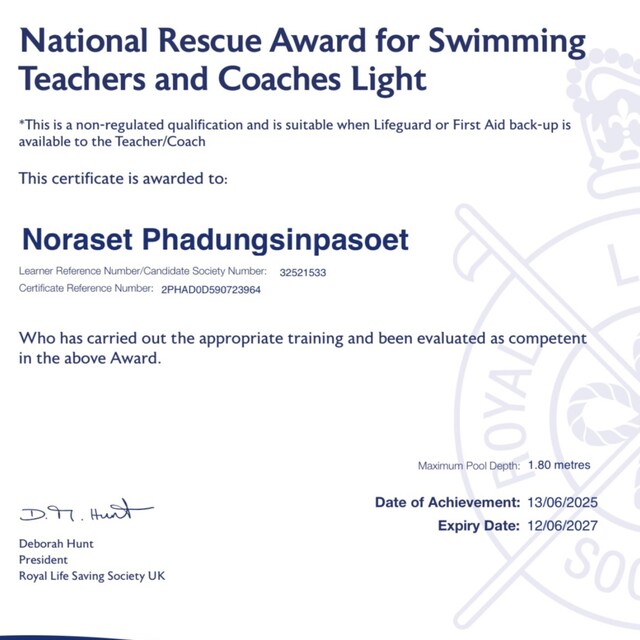 สวัสดีครับ ผมเป็นครูสอนว่ายน้ำที่โรงเรียนนานาชาติ King’s College International School Bangkok และได้ผ่านการอบรมใบรับรองว่ายน้ำระดับ Level 1 , 2 ของสมาคมว่ายน้ำแห่งประเทศไทย มีประสบการณ์สอนเด็กและผู้ใหญ่ ทั้งแบบตัวต่อตัวและแบบกลุ่ม 2-3คน เน้นความปลอดภัย เทคนิคที่ถูกต้อง และพัฒนาทักษะให้เหมาะกับผู้เรียนแต่ละคน