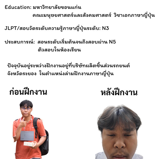 ประสบการณ์: มหาวิทยาลัยขอนแก่น คณะมนุษยศาสตร์และสังคมศาสตร์ วิชาเอกภาษาญี่ปุ่น