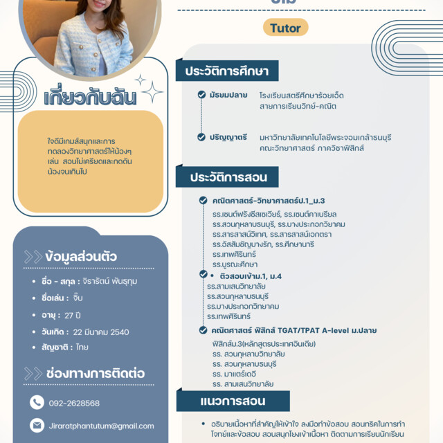 ชื่อ จิรารัตน์ พันธุทุม ชื่อเล่น จิ๊บ