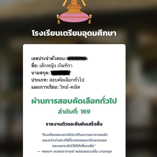 - สอบเข้าเตรียมอุดมลำดับที่ 169