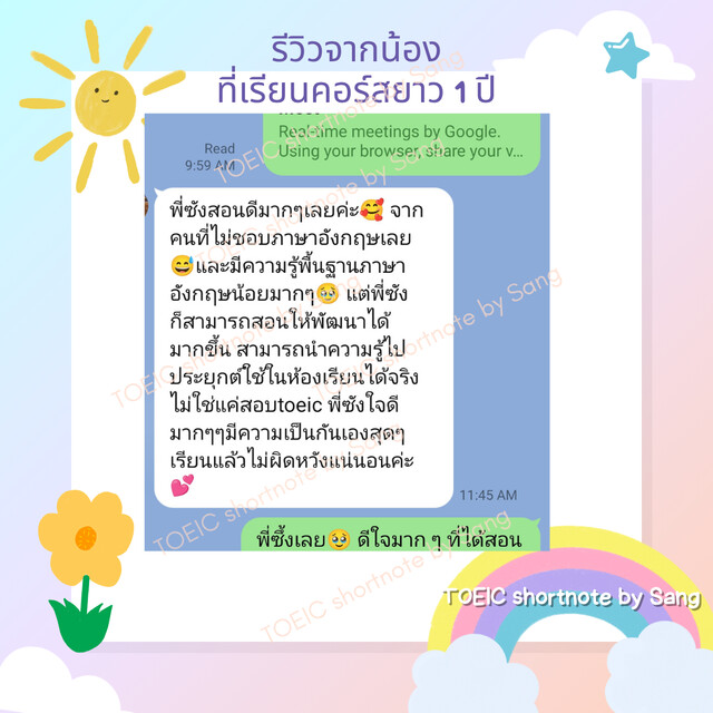 มีไฟล์เอกสารการสอนฟรี ชีทศัพท์ฟรี/ ทริคในการเตรียมสอบและพาวิเคราะห์โจทย์ทั้ง 7พาร์ท Listening & Reading / Grammar review / หรือจะเลือกติวเฉพาะพาร์ทที่ต้องการก็ได้ค่ะ/ติวด่วนคืนก่อนสอบ ทักมาสอบถามเวลาก่อนได้ (รอบกลางคืนหลัง2ทุ่มคิดราคาพิเศษ+50บาทนะคะ)