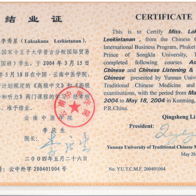 สอนภาษาจีนเพื่อนการทำงานในโรงแรม โดยสอนพนักงานที่โรงแรมเดอะฟร้อนท์วิลเลจ และมีคลาสสอนเดี่ยวสอนแยกที่บ้านของผู้เรียน