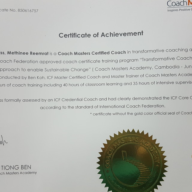- ใบเซอร์รับรองการอบรม life coach โค๊ชชีวิต ระดับสากล จาก ICF สหรัฐอเมริกา