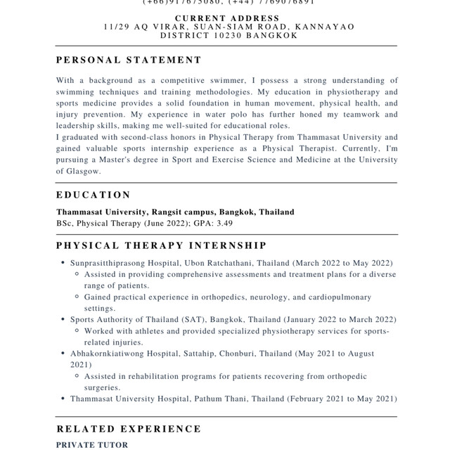 - มีประสบการณ์การเป็นนักกีฬาโปโลน้ำ 5 ปี
