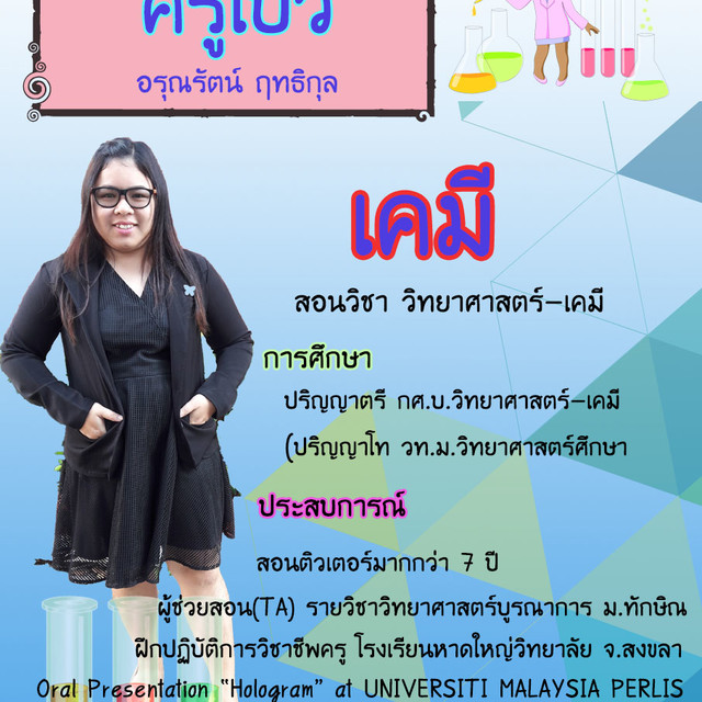 สวัสดีค่ะ ครูพี่โบว์ นะคะ ยินดีต้อนรับน้องๆ ที่ต้องการปรับพื้นฐาน วิทยาศาสตร์ คณิตศาสตร์ เคมี ทั้งระดับมัธยมศึกษา และมหาวิทยาลัย หรือจะเป็นสอนการบ้านตะลุยโจทย์ แนวข้อสอบเตรียมสอบเข้าโรงเรียนชั้นนำ ปัจจุบันพี่ศึกษา ป.โท วิทยาศาสตรศึกษา และเปิดติวเตอร์เพื่อให้มีหลากหลายวิชาสำหรับน้องๆ สอนโดยครูที่เชี่ยวชาญในแต่ละสาขา เน้นสอนตัวต่อตัวและกลุ่มย่อย หากอยู่ต่างจังหวัดสามารถสอนออนไลน์ได้จ้า ลักษณะการสอนเน้นความสนุก เป็นกันเอง แก้ปัญหาการเรียนที่ตรงจุดเป็นรายบุคคล สามารถปรับความเข้มข้นได้ตามต้องการของน้องๆ ยืดหยุ่นได้ทั้งเวลา และเนื้อหาการเรียน ประสบการณ์สอนทั้งในโรงเรียน ตัวต่อตัว และผ่านการติว O-NET 9วิชาสามัญ PAT2 ในสถาบันการศึกษาชั้นนำต่างๆ กว่า 8 ปี