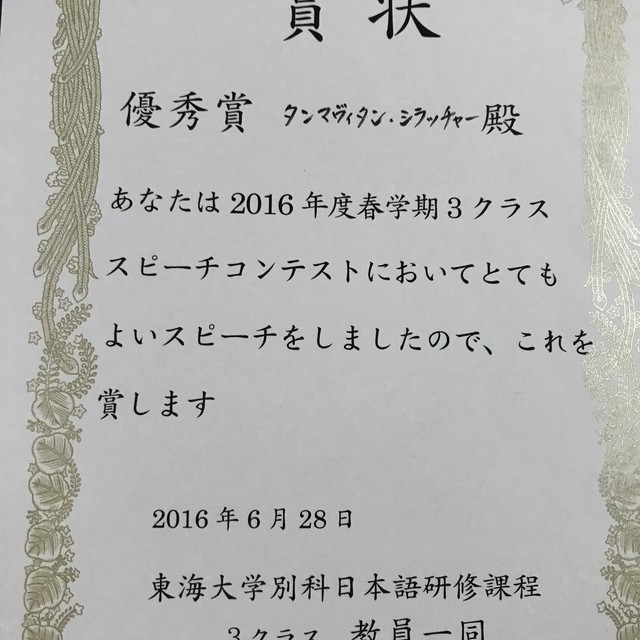 ได้รับรางวัลชนะเลิศSpeech Contestภาษาญี่ปุ่น ที่มหาวิทยาลัยโตไก ปี2016