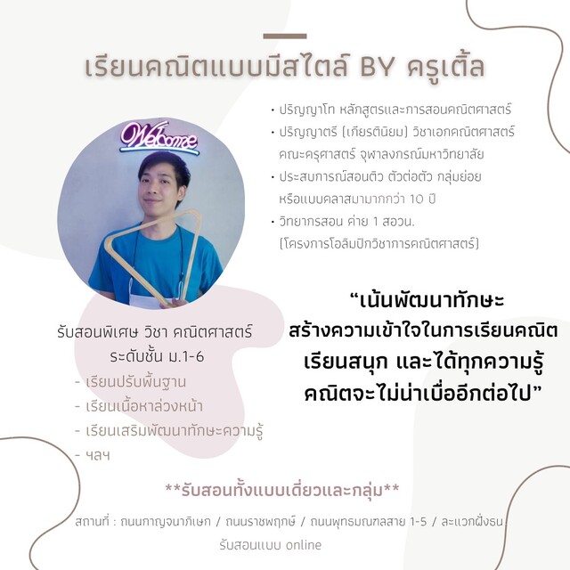 - มีประสบการณ์สอนติว ตัวต่อตัว กลุ่มเล็ก หรือแบบเป็นคลาส มากกว่า 10 ปี